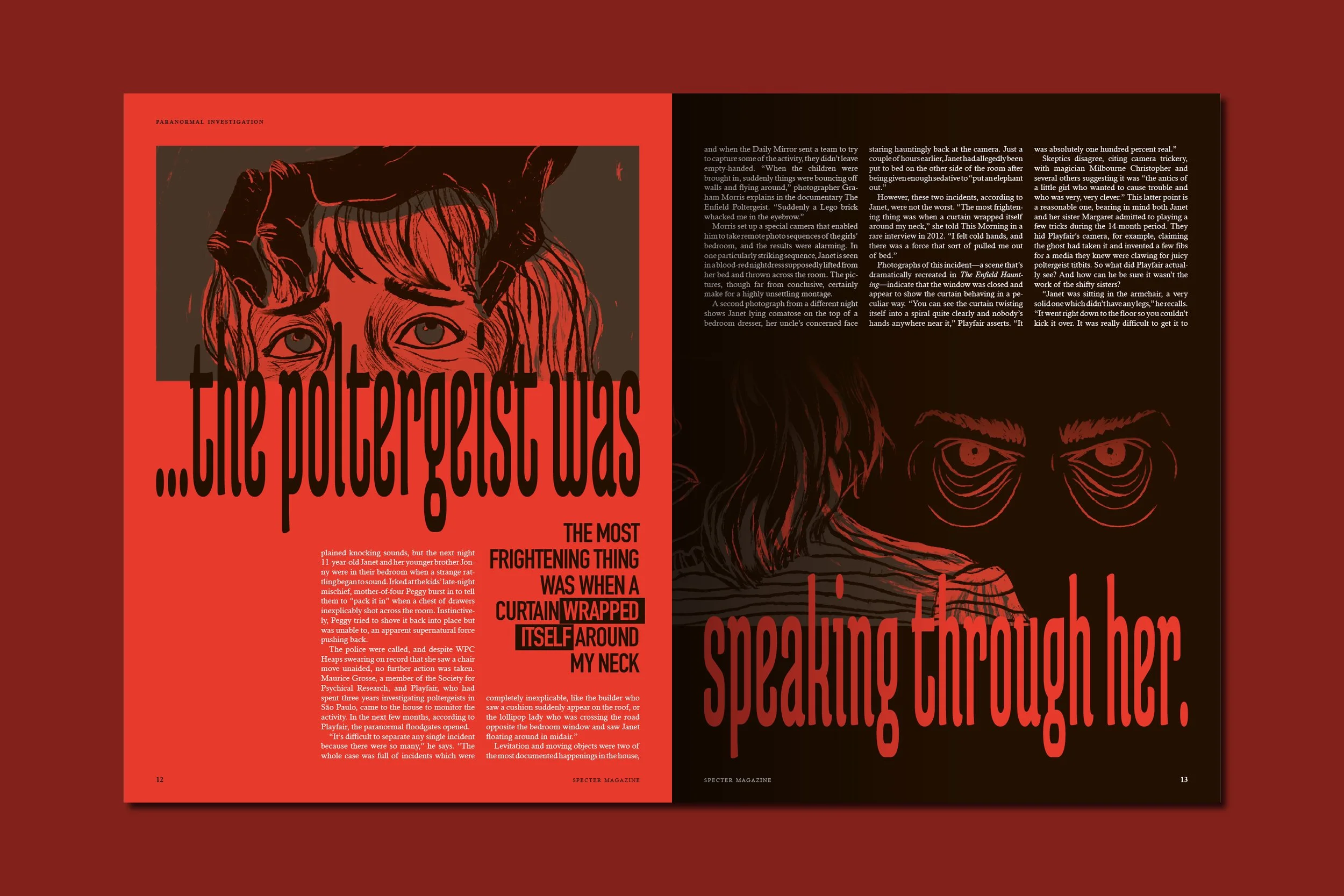 For the magazine's illustrative article, the spreads illustrate the historical accounts in an article by Mark Pickering, titled The Poltergeist That Plagued a North London House. The written piece explores the infamous 1977 paranormal case of the Enfield haunting in England, with a family—particularly a young girl named Janet—allegedly being terrorized by paranormal forces in their own home. The article recounts these claims through the experiences of Guy Lion Playfair, a man who investigated the case, with illustrations bringing these events—and what they say was happening to Janet—to a thrilling reading experience.