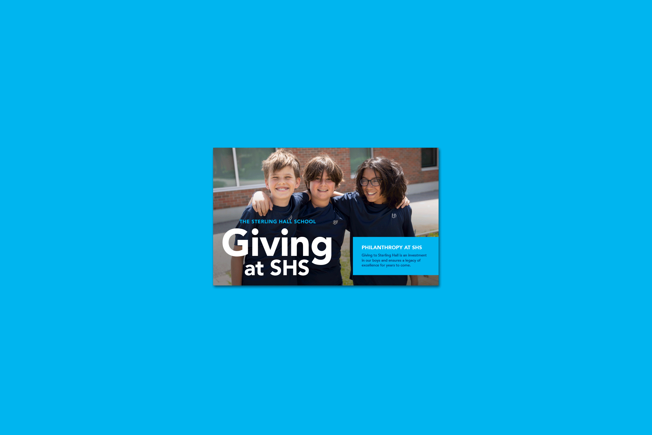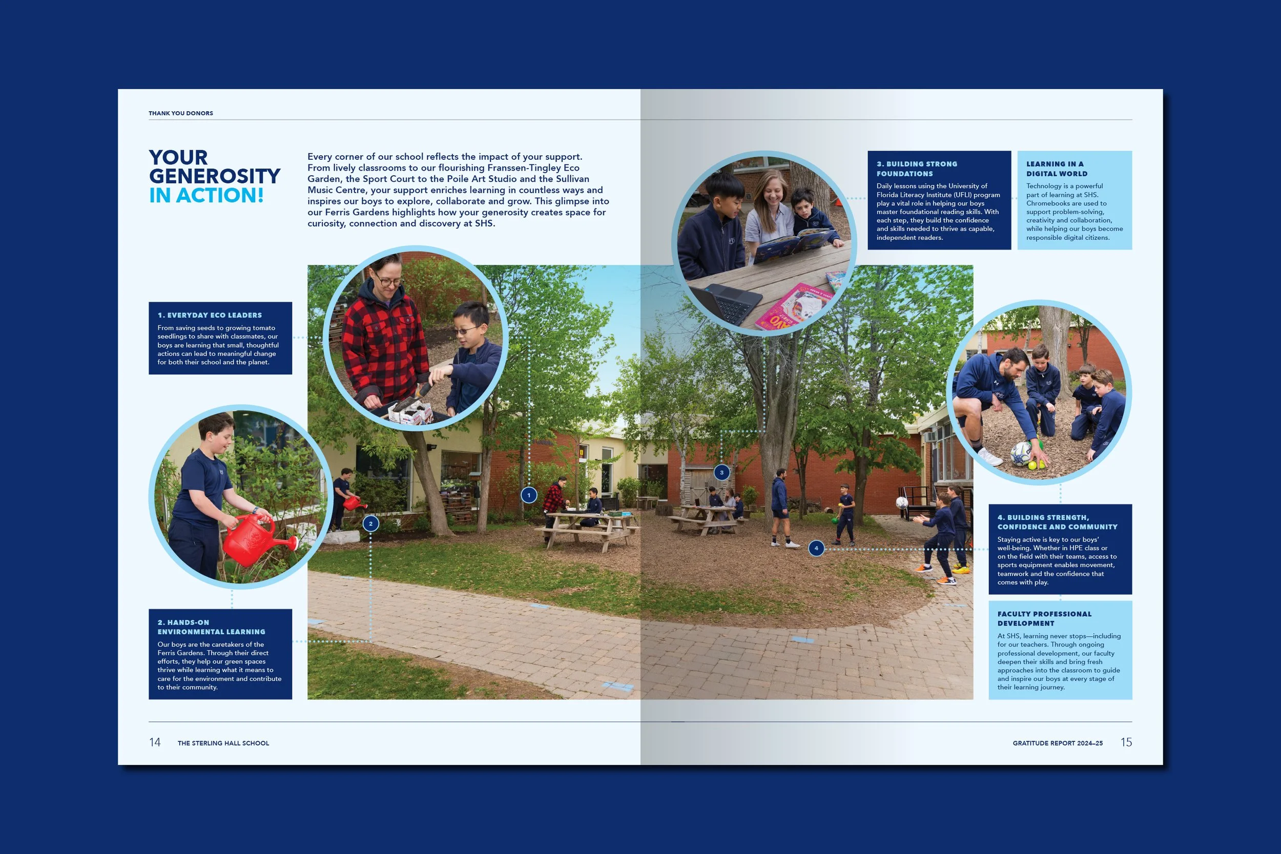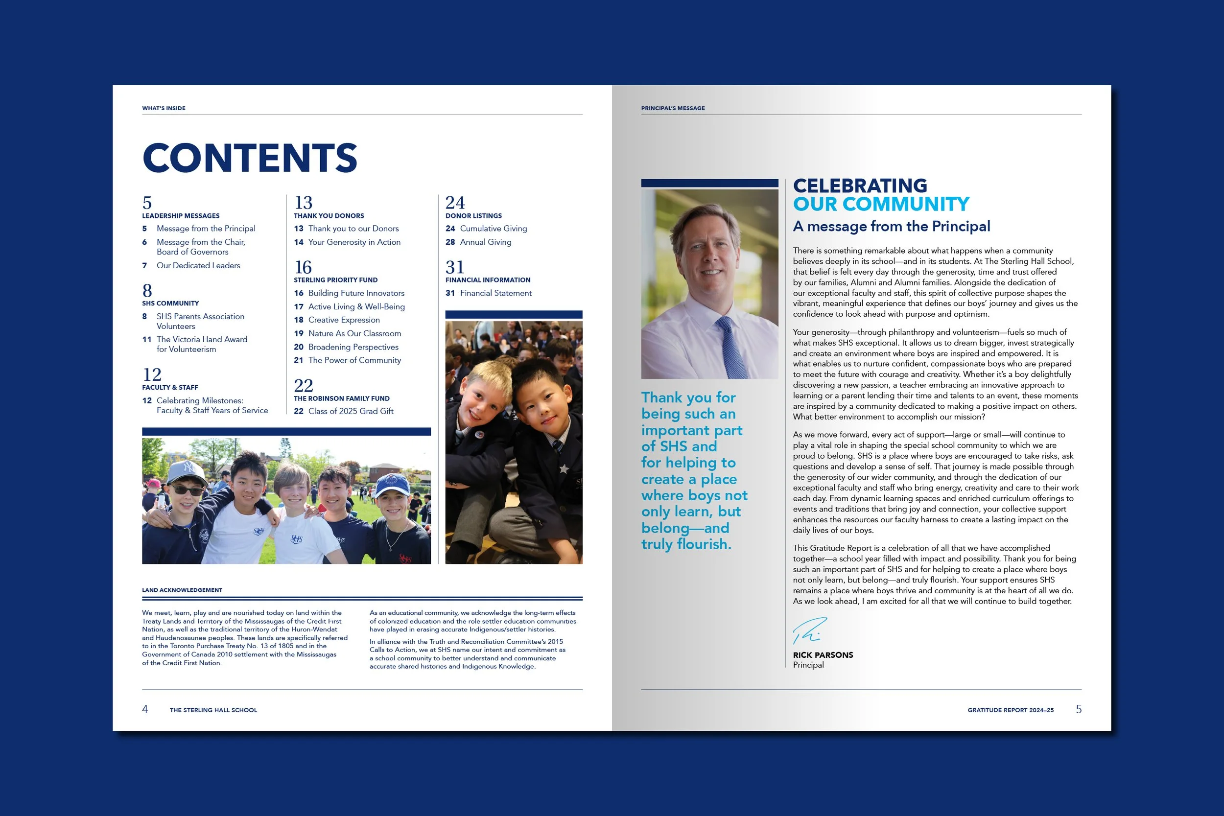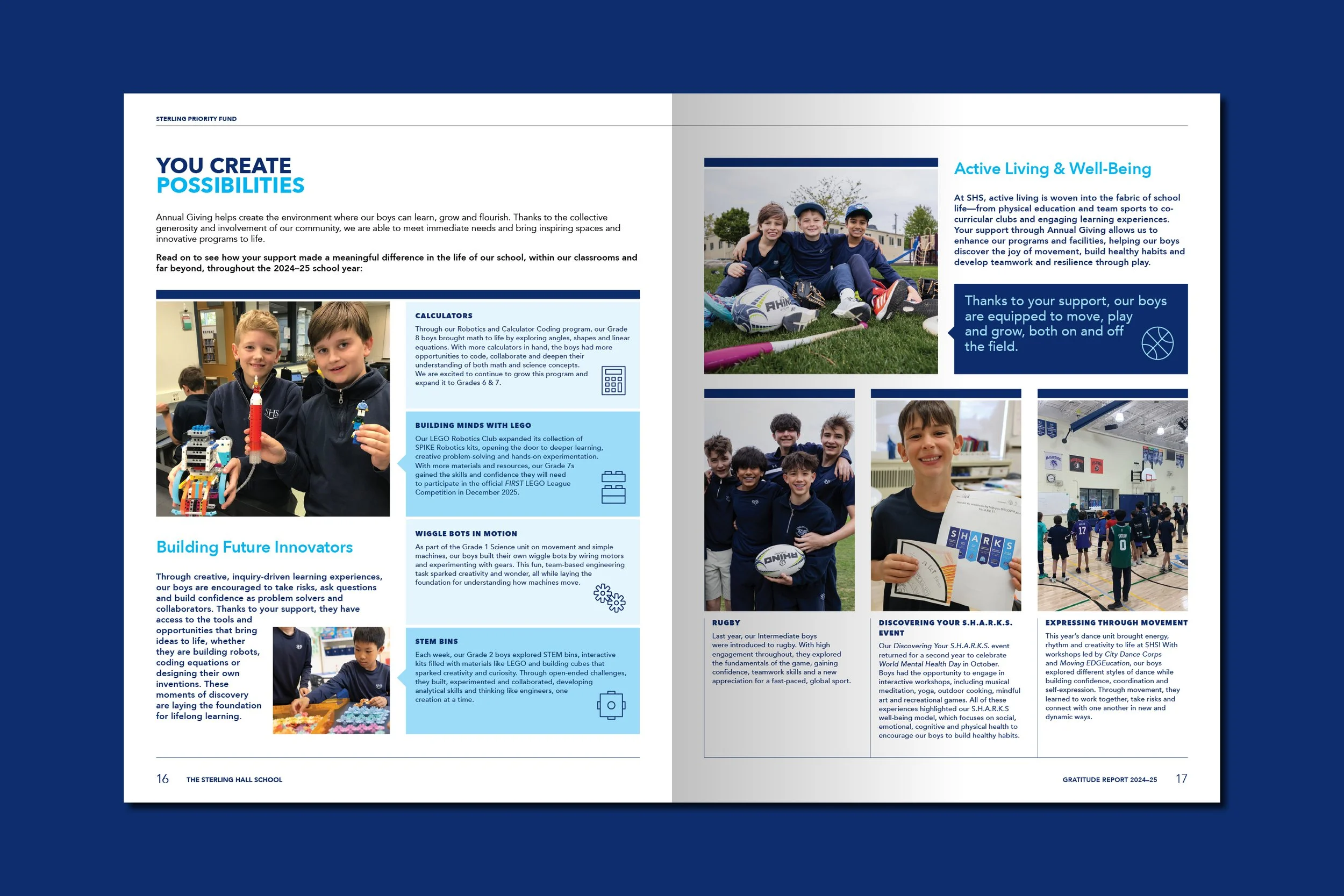 Whether it’s through their annual Gratitude Report that recognizes their school community and supporters for their contributions to the school, their yearly White & Blue publication that reflects on the school year, or a new campaign that embodies academic excellence, they all help to illustrate the collective devotion and vision for their students’ educational and social development, which is what makes SHS exceptional. These brand deliverables use meaningful iconography, energetic colours, and candid photography that shows boys embracing and being themselves in order to visualize SHS’s impact and commitment to boys.